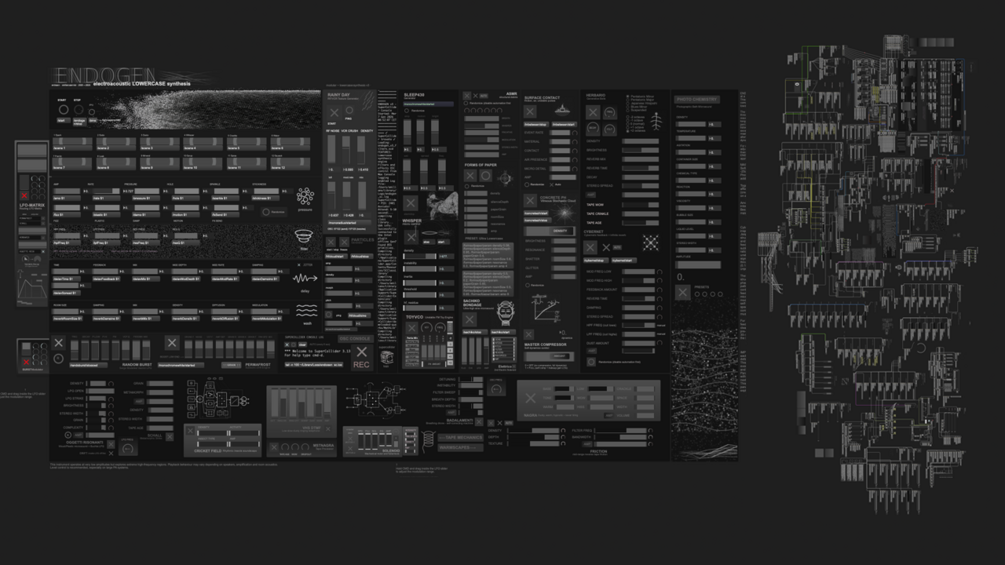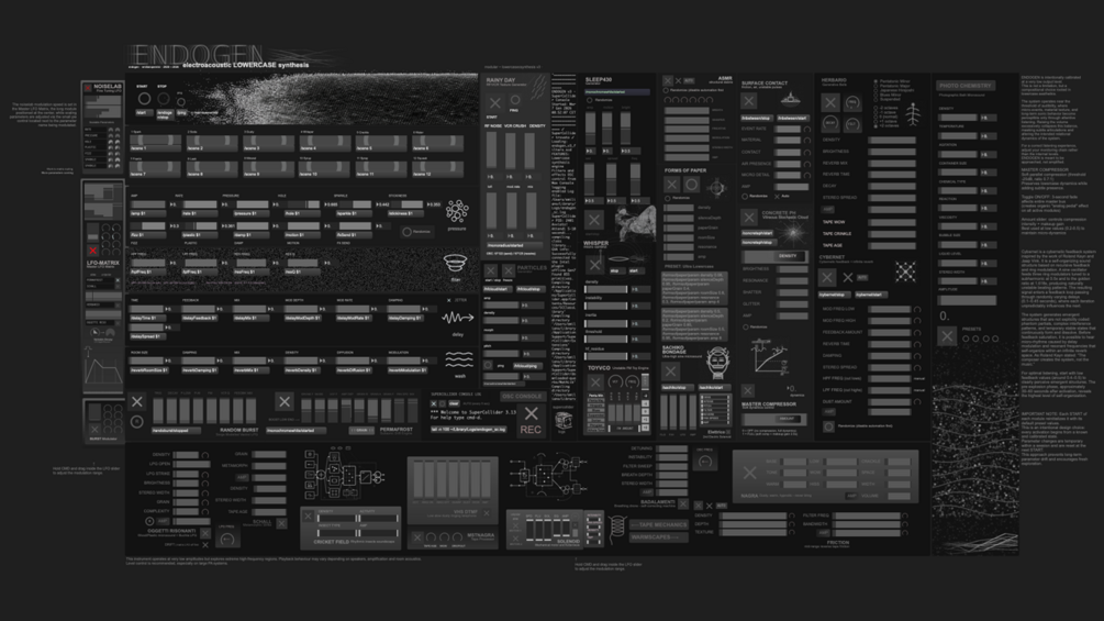ENDOGEN is a Max/MSP + SuperCollider synthesis environment designed for lowercase music, microsound, and deep atmospheric drone.