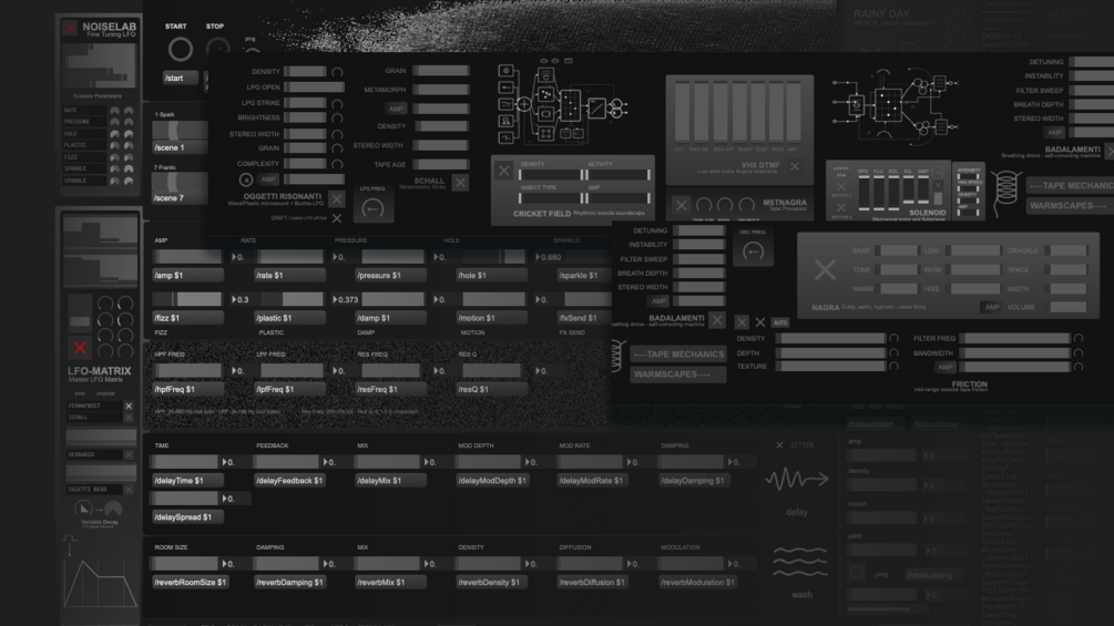 - Physical approach — modules modeled after vactrol dynamics, tape machines, mechanical systems, resonant objects